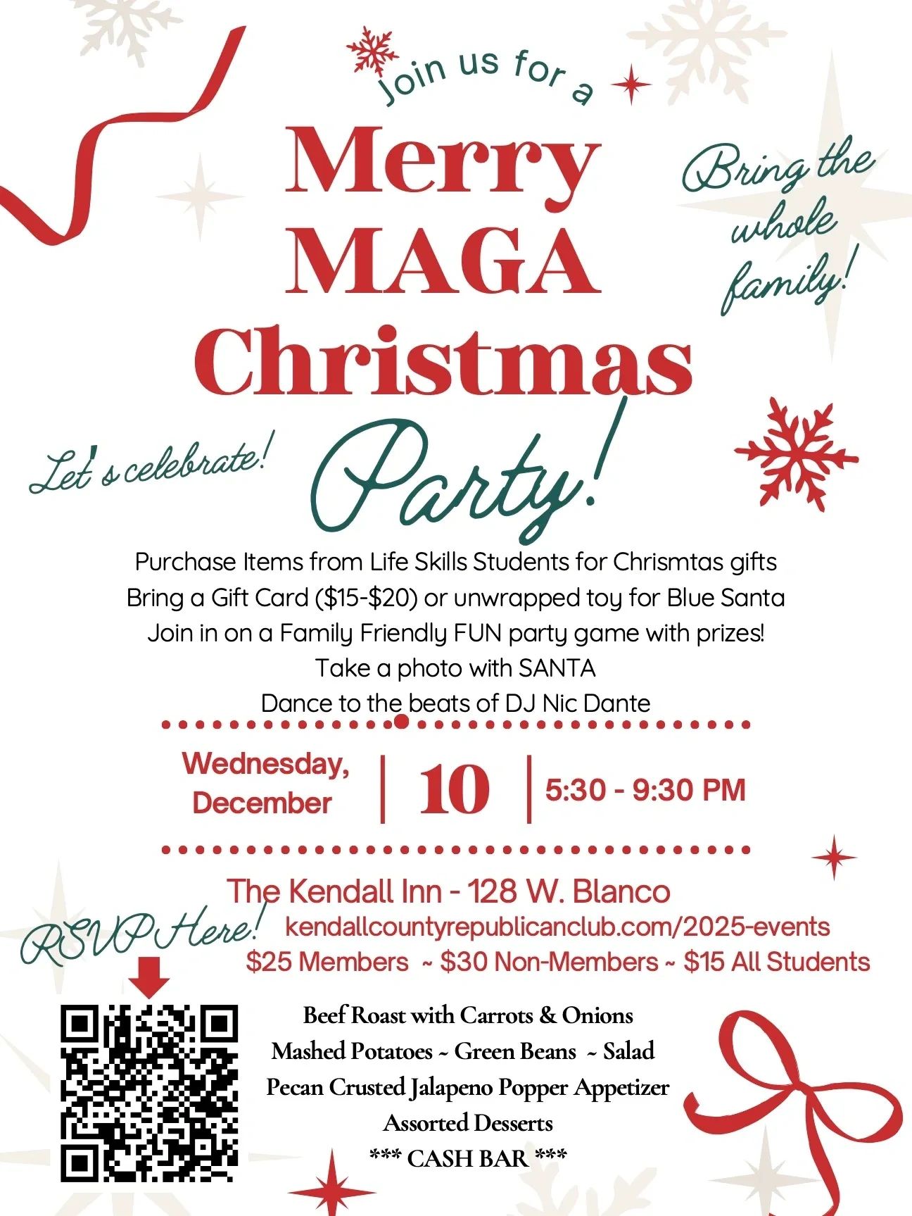 Dinner is sponsored by Kendall County Republican Party, KCRC, & KCWC